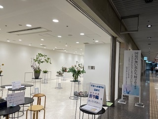 It was a great honor for us to be able to exhibit ikebana in Hiroshima on August 6. A total of 16 beautiful works were displayed in the open space. This year’s exhibition was held at a venue slightly apart from the Central Plaza but closer to the Atomic Bomb Dome, on the occasion of the 80th anniversary of the atomic bombing. Although the venue was smaller and the number of works fewer than in previous years, many people stopped by to view the arrangements—both on their way to the Peace Memorial Ceremony in the early morning and on their return after the ceremony or after visiting the cenotaph. Visitors were also invited to fold paper cranes as a heartfelt message for peace.