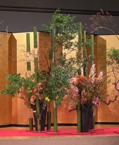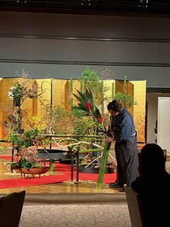 The first work, featuring persimmon branches, lilies, chrysanthemums, and boke (Japanese quince), evoked the scenery of the mountains. Next, using bamboo tubes, green branches, wild rose berries, chrysanthemums, lilies, and dried pampas grass, he represented the gentle atmosphere of an autumn bamboo forest. Then, with split bamboo placed both inside and outside, a bridge leading toward the sea took form. A ship adorned with fall-colored hydrangeas seemed to float upon the sea, beautifully expressing the flow of nature. The final work was a balanced work of bamboo and red ginger flowers. As the sound of dripping water played softly in the background and the crisp crack of splitting bamboo resonated through the hall, the audience was captivated in silence. When the final work was completed, the hall was filled with resounding applause. He closed the demonstration with the inspiring words, “Through Ikebana, I wish to bring light and to build bridges that connect many places.”