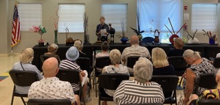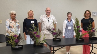 Simultaneously, eight participants (seven guests and one new member) were given a hands-on treat to create an Ichiyo beginner’s arrangement taught by Sensei Jeanne Houlton. This was done as a marketing tool and to offer new members the opportunity to try a school before deciding which one to study. The participants were very pleased with their creations . Afterwards, one person joined our chapter and three other signed up for classes with three teachers from different schools.
