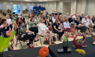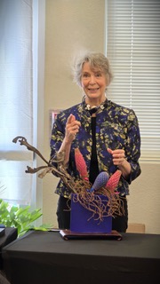 We were delighted to welcome a full house for Mary Sharrow’s inspiring demonstration, themed “I Never Met a Stick I Didn’t Like”. To call it a “demonstration” hardly does it justice—Mary created 17 arrangements, turning the program into a mini-exhibition. Each piece revealed the endless possibilities of form, texture, and imagination. Her chosen theme, “gifts from trees,” came alive in ways that made us all see branches, sticks, seed pods, inflorescences, and other natural treasures with fresh eyes. Some of the specific material used included contorted mulberry branches, Harry Lauder’s walking stick, Benalu wood, mitsumata, manzanita, curly willow, driftwood, eucalyptus “well covered” bark tree and kiwi vine.