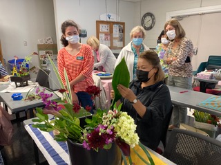 The Demonstration/Workshop was held at our Chapter Meeting on October 7, 2021. Sensei Emiko Suzuki demonstrated manipulation techniques by using supermarket flower bouquets and a variety of line materials to fit members’ seldom used vases.